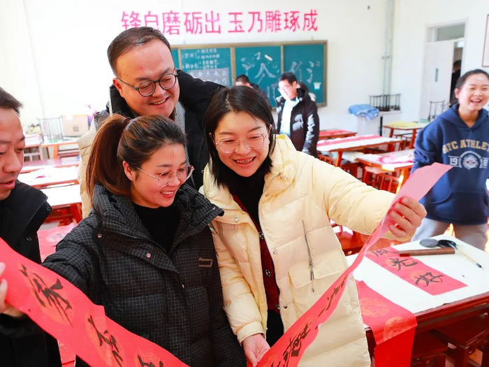 2023年1月3日,民乐工业园区学校老师出对子,写春联,庆祝乔迁之喜。元旦前,他们拿到了新教师公寓房间的钥匙,解决了回家远、不方便的问题。通讯员 马绮徽 摄