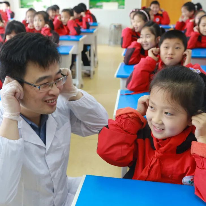2022年3月1日,山东省高密市康成小学学生在医生指导下做护耳操,让他们从小了解护耳常识。李海涛 摄