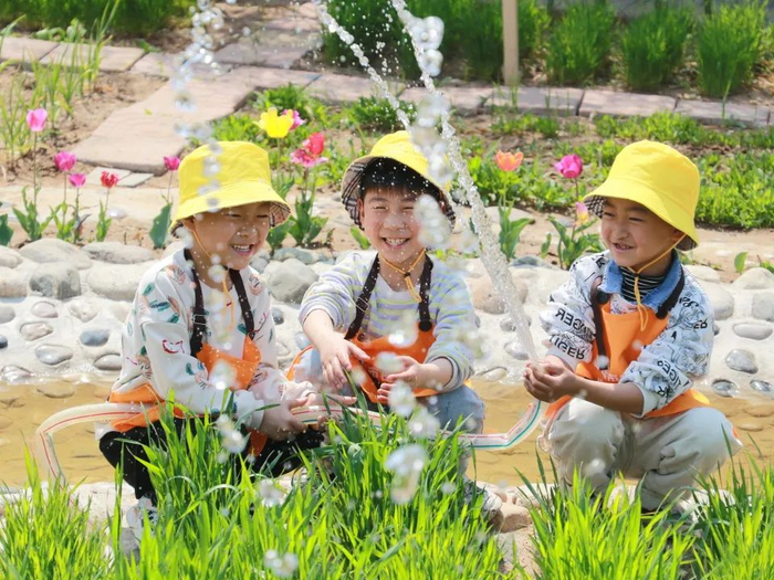 2022年4月18日,山东省高密市密水街道中心幼儿园的小朋友们在老师的带领下来到种植园区,观察植物长势、赏花、给小麦浇水。李海涛 摄