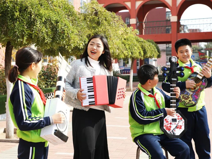 2022年10月31日是“世界勤俭日”,河北省唐山市丰润区团结路小学的学生在利用废旧物品制作手工艺品。教师和学生一起展示用废旧物品制成的“乐器”。朱大勇 摄