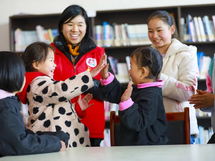 2023年1月8日,党员志愿者在贵州省黔西市雨朵镇易地扶贫搬迁点农家书屋的活动室里和孩子们一起做拍拍手游戏。通讯员 周训超 摄