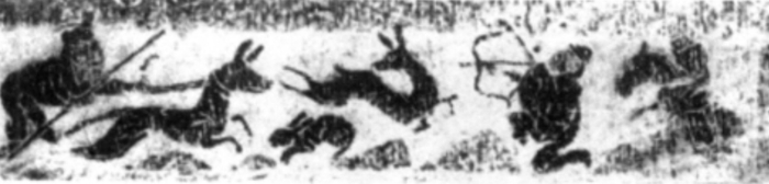 汉代的画像石、画像砖中,也有很多捕猎兔的画面。如南阳王庄出土的汉石画像显示,山岭之中,猎者呼唤着猎犬,两只猎犬从兔后面追逐,一只奔到兔前面突然转身拦截。