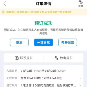 订房小贴士:1、预订时注意房间的取消规则,一般平台都会标明不能取消、限时取消、免费取消等提示。2、预订热门旅游目的地民宿等产品,要注意房间订单的确认时效,如在旺季旅行,建议可以通过平台客服提前与民宿方进行沟通确认房态信息以防万一。3、如果因特殊原因或不可抗力因素不能入住,及时出具相关证明给到平台方客服进行退订沟通。