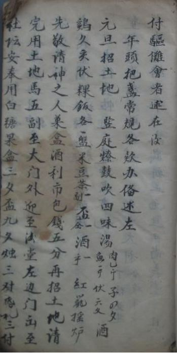 《尚义堂常规》首先记录了程氏宗族内部的过年习俗:“元旦招土地,竖庭燎、鼓吹,四味汤(肉一斤,子四只,鱼一斤,伏六只),鸡、鱼、亥、伏、粿、饭各一盘,米、豆、茶一副,杯一仝,酒一乎,红笼摇炉。敬请神之人,果盒、酒、利市包,钱五分。”“招土地”,也就是以香烛爆竹迎请土地。届时在庭间点燃香烛,备设鼓吹。四味汤中的“子”,也就是鸡蛋,“伏”即“腐”(亦即豆腐),“亥”则是以地支指代猪肉。在民间文书中,“壶”一般写成“乎”,所以“酒一乎”也就是酒一壶。迎请土地的仪式要重复两次,第二次结束后,应烧掉五副土地纸马,将香火从大门外迎至后堂,由左边门出,至社坛安奉土地牌位。接着再行礼如仪,安置社公、玄坛(财神)、香火(全称为“家堂侍奉长生香火”)和尊长等,届时满堂点灯,内外通透。