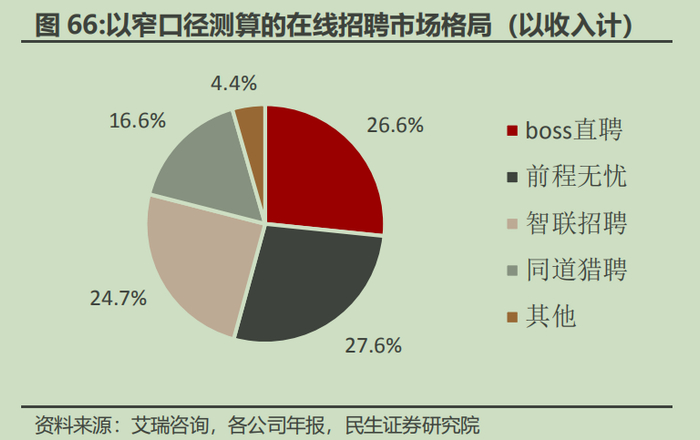 在B端接入企业的数量和C端每日、每月活跃用户数、营收增速等方面,Boss直聘各项数据均领先,民生证券认为其有望凭借对中小企业的招聘效率的优势,成为行业龙头。