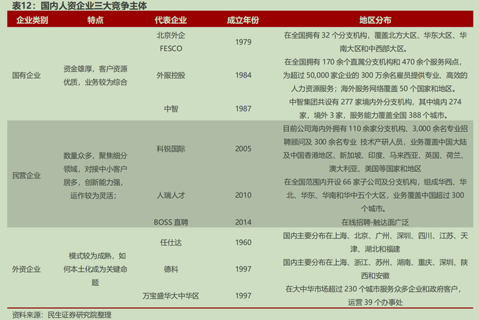 整体来看,国内人资企业有三大竞争主体,国企、民企和外资企业。