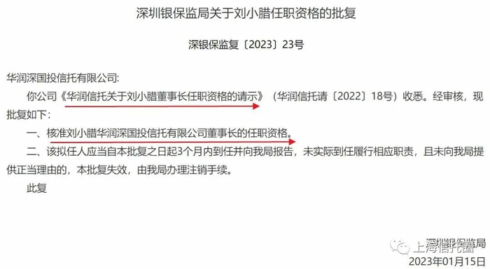 1月20日,银保监会官网披露,核准刘小腊华润深国投信托有限公司(简称:华润信托)董事长的任职资格。