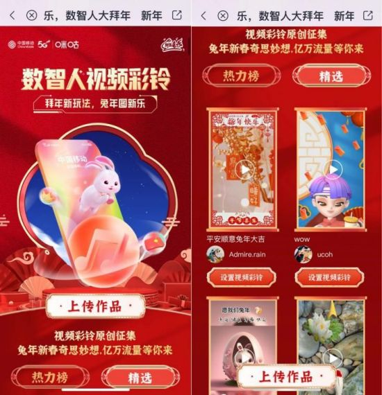 有才华、爱创作的朋友们速速集合,原创视频彩铃征集火热进行中!以“2023 NICE 兔MEET YOU”“玉兔闹元宵”为主题,创作春节或元宵相关视频彩铃,或参与歌曲翻唱、BGM二创,亿万流量等你来!快快尽情挥洒才华,在超3亿用户的中国移动视频彩铃平台展示自己的原创作品,体验全新的春节打开方式!