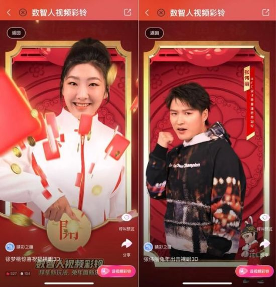 来自元宇宙的来电祝福你收到了吗?咪咕音乐精心定制的多种拜年视频彩铃已上新:咪咕数智人家族组团送祝福,徐梦桃、张伟丽等明星裸眼3D视频彩铃,还有2022年新生熊猫团子萌力来袭,覆盖多元拜年场景需求,设置任意拜年视频彩铃内容还能抽红包,迎接喜气连连好福气!
