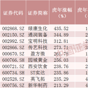 Wind数据显示,剔除上市的新股后,虎年十大牛股分别是绿康生化、通润装备、宝明科技、传艺科技、盈方微、圆城黄金、西安饮食、ST实达、英飞拓、新华制药,涨幅最大的绿康生化虎年累计上涨435.52%。
