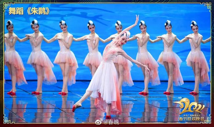 2021年春晚,上海歌舞团二度受邀,携原创舞剧《朱鹮》片段再次登台。朱鹮是象征幸福吉祥的美丽珍禽,被称为“吉祥之鸟”。舞者们化身一个个纯美的小精灵,用纤细的肢体,打开了东方的魅力。