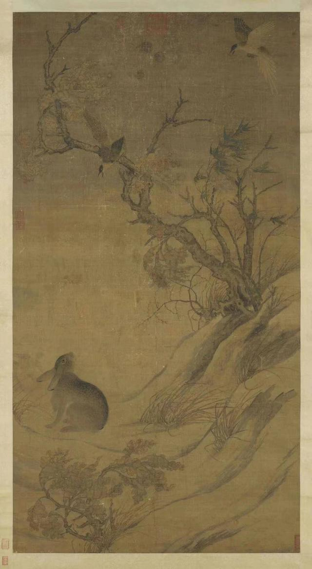 而喜爱兔兔并非现代人的专利,自古以来兔子就是人们心目中的最佳吉祥物,更是文人墨客趋之若鹜地临摹圣物。北宋画家崔白,在他的传世名作《双喜图》中,画出了一只中国绘画史上最精彩兔子,想必大家应该也在网络上不止一次刷到。图中,兔子仰头张望空中两只斗艳的喜鹊,勾勒出了一幅极其立体且生动的画面,成为传世经典。