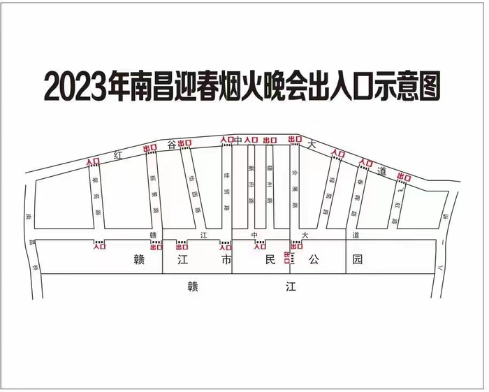 红谷滩区2023年南昌迎春烟花晚会观赏区域设置在八一大桥至南昌大桥之间的赣江市民公园和赣江中大道等区域,区域内根据演出时间段对出入口进行设置。