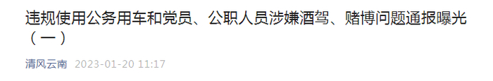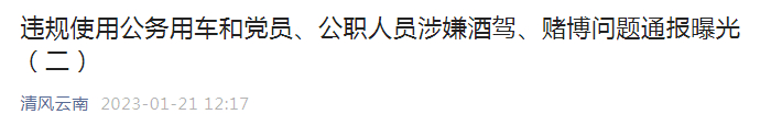 云南省纪检委官方微信公号“清风云南”在1月20日及21日连续两期、每期通报了3起党员、公职人员涉嫌酒驾问题。