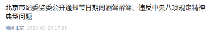 据“清风北京”微信公号1月20日消息,北京市纪委监委通报了多起查处的酒驾醉驾问题。