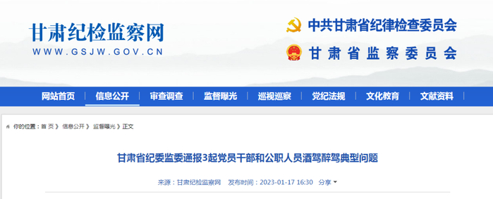 1月17日,甘肃纪检监察网通报了3起党员干部和公职人员酒驾醉驾典型问题,详情如下: