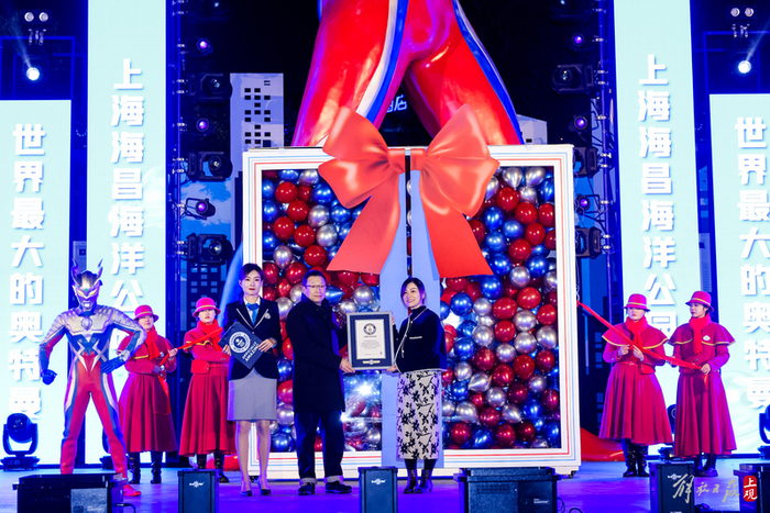 据悉,上海海昌海洋公园巨型赛罗奥特曼雕塑含结构重达3.8吨,包含结构师,雕刻师,艺术上色师等20余人参与制作。未来一整年,吉尼斯认证牌匾将持续竖立在奥特曼电音广场,欢迎市民游客前往见证打卡。