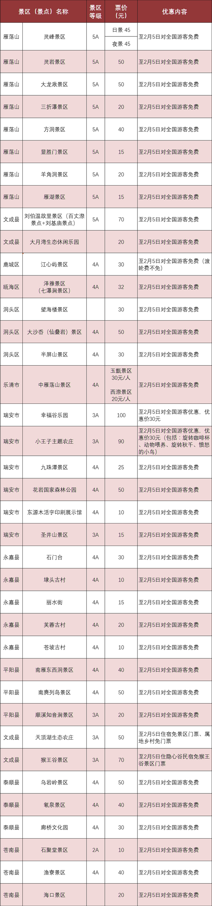 即日起至2月5日,温州包括雁荡山、刘伯温故里、江心屿、石门台、南麂列岛等38家景区景点面向全国游客推出春节免门票及惠游政策,58家景区对全国医务人员推出的免票游政策持续至3月31日。