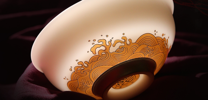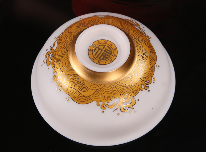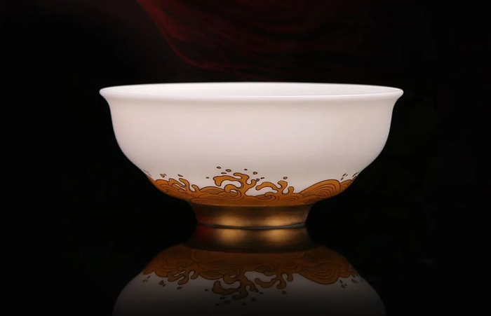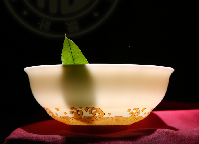 碗面海浪纹案采用德国贺利氏24K浮雕堆金工艺制作。