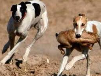 组织者一声令下,放跑手里的野兔。参赛的细狗瞬间开跑,谁捕捉到野兔者为胜。
