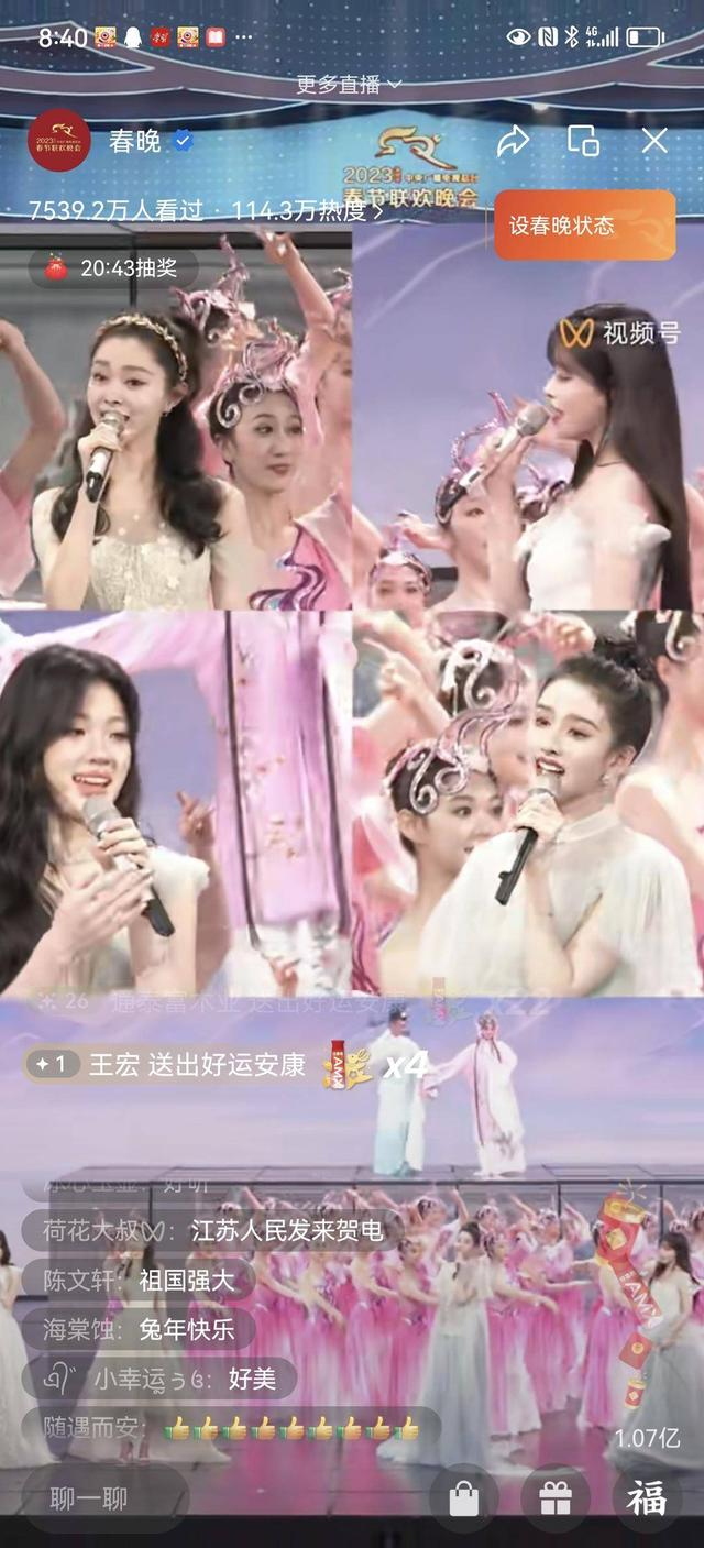 春晚引发的各种话题也不断在微博和朋友圈同步发酵,不断登上热搜。看央视镜头下的明星,不少网友感慨,和王二妮唱《好运全都来》的邓超,以及大张伟都是氛围选手。唱着《小哥》的黄渤,这场景咋有点眼熟?有网友表示,“黄渤咋又上跑步机了?穿着工装裤连体裤,从2014年跑到2023年。”还有诸如“撒贝宁和苏有朋谁的鞋跟高”“唐诗逸好美”等春晚话题也被网友热议。