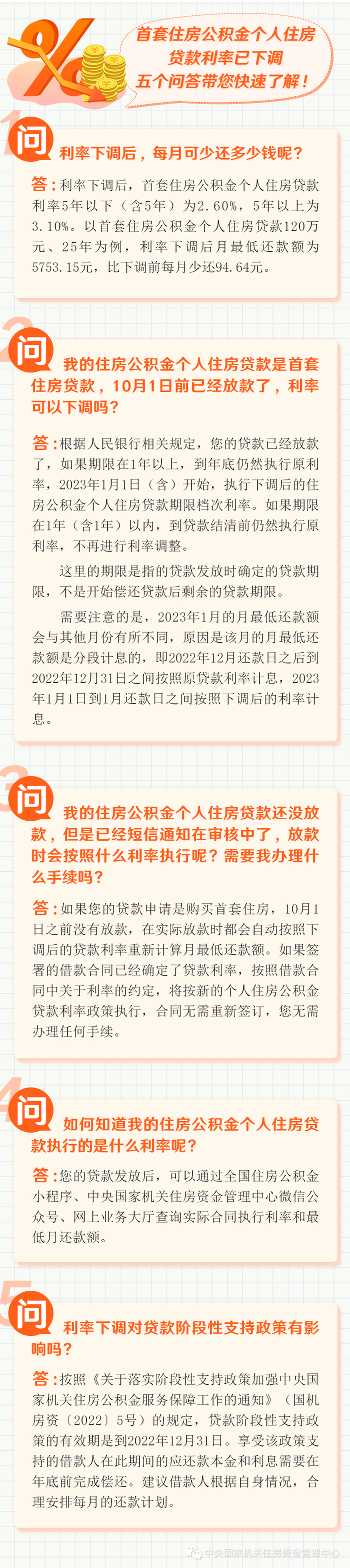 中国人民银行决定,自2022年10月1日起,下调首套个人住房公积金贷款利率0.15个百分点,5年以下(含5年)和5年以上利率分别调整为2.6%和3.1%。
