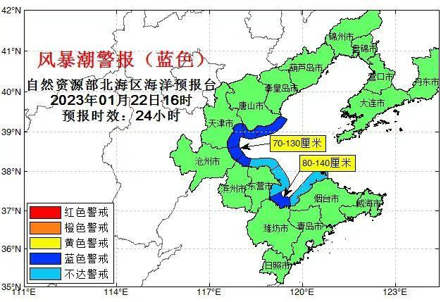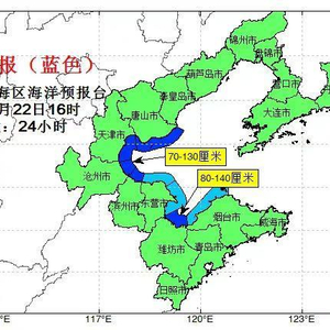 自然资源部北海区海洋预报台1月22日16时发布风暴潮蓝色警报和海浪蓝色警报。预报显示,受较强冷空气影响,预计1月23日凌晨至傍晚,渤海湾和莱州湾沿岸将分别出现70-130cm和80-140cm的风暴增水。曹妃甸、塘沽、黄骅、滨州港、羊口港和潍坊港验潮站将出现达到当地蓝色警戒潮位的高潮位。天津市、河北省唐山市和沧州市、山东省滨州市和潍坊市预警级别为蓝色。
