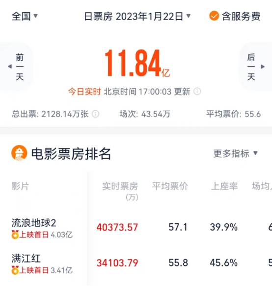 截至1月22日17点,《流浪地球2》、《满江红》实时票房分别为4.04亿元、3.41亿元,在场均人次、上座率等方面的数据也较为接近。