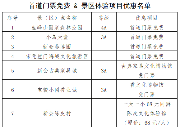 春节期间(1月21日至27日),江门新会旅游放大招,全部景区实行首道门票免费(不包括该景区内单独收费的小景区、或景区内需要另行收取的交通费用),包括小鸟天堂、宋元崖门海战文化旅游区、新会葵博园等收费景点。