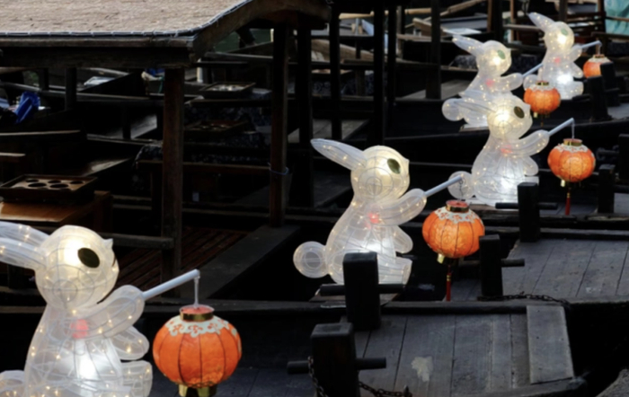 前段时间在西湖边火出圈的“兔子船”,1月18日来到了杭州西溪国家湿地公园福堤摇橹船码头,将一直持续到元宵节。小兔子提着的福字灯笼用的布料图案,则来源于宋朝古画中的民间女士服装花色——莲花,寓意着吉祥福寿,与“走福堤,沾福气”的美好寓意相呼应,让游客感受到西溪的宋韵文化传承与生活艺术积淀。