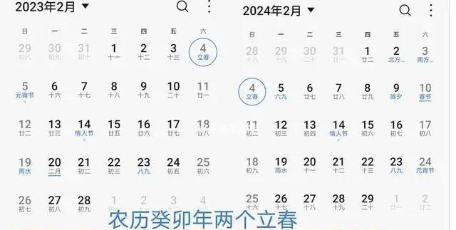 双春年,即一年中有两个立春日。第一个立春日是在农历癸卯年的正月十四日;第二个立春日则是在农历癸卯年的腊月二十五。造成双春年的原因,是历法“阴差阳错”所致。阳历是按照太阳的运行轨迹计算的,而阴历是按照月亮的盈亏变化规律制定的。这样阴阳历就出现了偏差,于是就产生了 “双春年”的独特现象。民间有“双春双喜”之说,就是说双春年是吉利的,人们往往会选择在这一年娶妻嫁女。谚语说:“双春兼闰月,结婚好时年。”还有谚语说:“一年打两春,黄土变成金”。因为立春后阳气上升,象征着勃勃生机,预示着丰收的年景。谚语说:“两春夹一冬,十个牛栏九个空。”一年内两个立春节气,风调雨顺,田地里的农活多,耕牛都去劳作了,牛栏自然是空的。谚语又说:“一年两个春,带毛的贵如金。”年初和年尾两个立春,冬季会比较寒冷,古人御寒多用皮衣,所以带毛的皮草特别贵。当然有的地方也有谚语说:“两春夹一冬,无被暖烘烘。”就是说双春年春天时间要长,暖和的天气比较多,容易出现暖冬。这些现象都是根据不同地区、不同年景而言,不可一概而论。