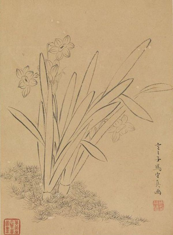 恽寿平(1633—1690),初名格,字寿平,后以字行,江苏武进人。初善作山水,因自谦无力与王翬(1632—1717)争胜,遂改工花卉。风格柔美秀雅,蔚为清代花卉画宗师。 本幅选自《摹古册》。以白描墨线钩绘水仙三株,转折处借淡墨分染浅深,蕊心则微染藤黄,花瓣外围再倒晕花青。虽然敷色浅淡,花叶摇曳间,宛若嗅得到一股幽香。水仙花季在寒风凛冽的一、二月间,造型优美,又带有独特的香气,适可为新春年节,平添祥瑞气息。