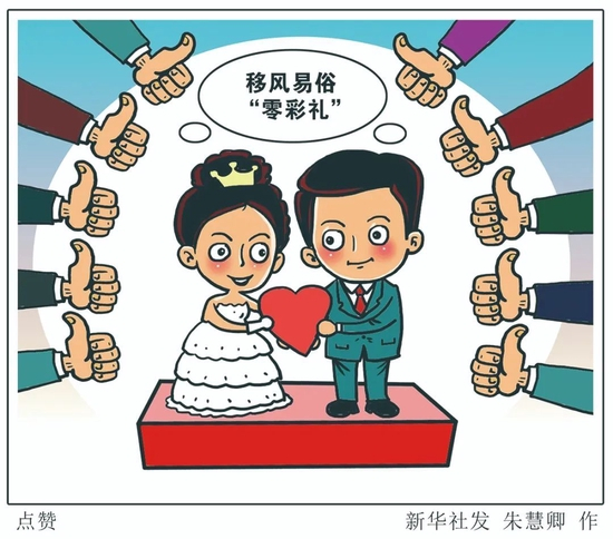 2019年7月,鹰潭市月湖区公布婚丧喜庆事宜操办标准,提出“结婚彩礼总数控制在8万元以内”“每对新人红娘一般不超过2人,媒礼每人每桩控制在1000元以内”等具体细则。月湖区委宣传部副部长董治华说,这些标准都是在充分打捞民意并结合当地实际后提出的,能够获得群众认可,推广较为顺利。2022年以来,区里涌现了21对“零彩礼”新人。
