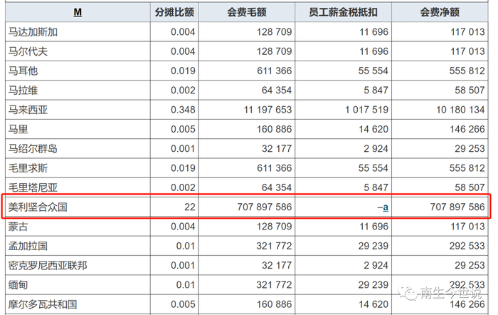 本年度预算总金额超过了32亿美元,抵消员工薪金税后,实际需要缴纳的会费净额约为29.9亿美元。美国仍占据榜首,承担的会费比例仍为22%,实际需要缴纳的会费净额在7.079亿美元左右。