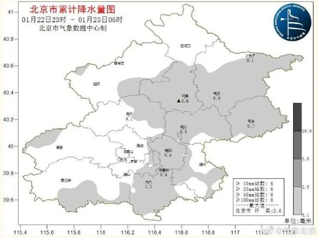市气象台发布22日23时至23日6时降水量(毫米):全市平均0.3,城区平均(朝,海,丰,石,东,西)0.2;东北(密,顺,平,怀)0.7,西北(延,昌)0.2,东南(通,大)0.2,西南(门,房)0.1;城区最大丰台和义0.8,全市最大怀柔2.6,最大小时降水强度怀柔椴树岭1.4毫米/小时(23日01时-02时)。