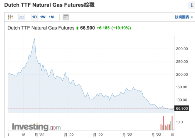 近期天然气价格大幅回落至2022年2月前的水平,这将进一步提振欧洲经济前景,目前天然气价格已从2022年夏天的疯狂飙升中暴跌近80%。截至1月23日,荷兰天然气期货上涨10.19%,报66.9欧元。