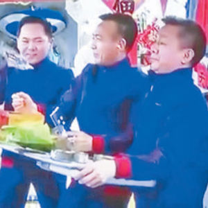 地面团队给航天员准备了丰盛的大餐:主食有水饺、桂花芝士年糕、血糯八宝饭3种,复水菜有紫菜蛋花汤、西红柿鸡蛋汤、翡翠白玉汤3种,还有饮料糖果若干;寓意“十全十美”的副食菜系,菜品色香味俱佳,菜名也都精心设计,饱含深深祝福,“鸿运当头”是椒麻鹅,“年年有余”是美味熏鱼,“金玉满堂”是松仁玉米,“势如破竹”是酸辣笋……