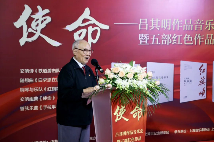 2022年,吕其明92岁。这一年,《红旗颂》特展在上海徐家汇绿地的百代小红楼开幕;五部红色作品新书首发式在上海交响音乐厅举办(钢琴与乐队《红旗颂》总谱版、交响组曲《使命》、随想曲《白求恩在晋察冀》、管弦乐曲《手拉手——中华大家园》以及交响诗《铁道游击队》),个人作品音乐会《使命》由上海爱乐乐团上演,钢琴与乐队《红旗颂》首演……又是音乐会,又是出书、办展,这样高密度的活动即使放在一位普通的青壮年身上也是很难完成的任务,但面对自己奉献了一辈子的音乐事业,吕先生精神矍铄且乐在其中。