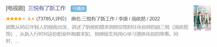 B站作为后起之秀,继去年的《突如其来的假期》后,今年也拿出了《三悦有了新工作》供市场检验。在豆瓣,有超过7万人为这部剧打出了8.4的高分,排在去年豆瓣剧集评分榜单的第三位。