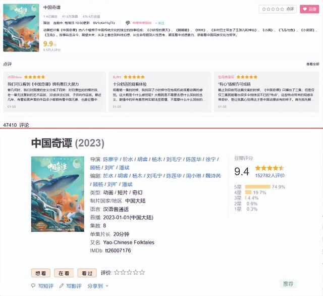 如果你现在还没有听说过《中国奇谭》,那一定是“OUT”了。截止到1月22日,《中国奇谭》在B站仅更新了五集,观看量已达1.4亿次,评分为惊人的9.9分。而在以打分严苛闻名的豆瓣电影上,近15万网友为《中国奇谭》打出了9.4分的高分,与《千与千寻》《大闹天宫》并列动画片分类评分第一。