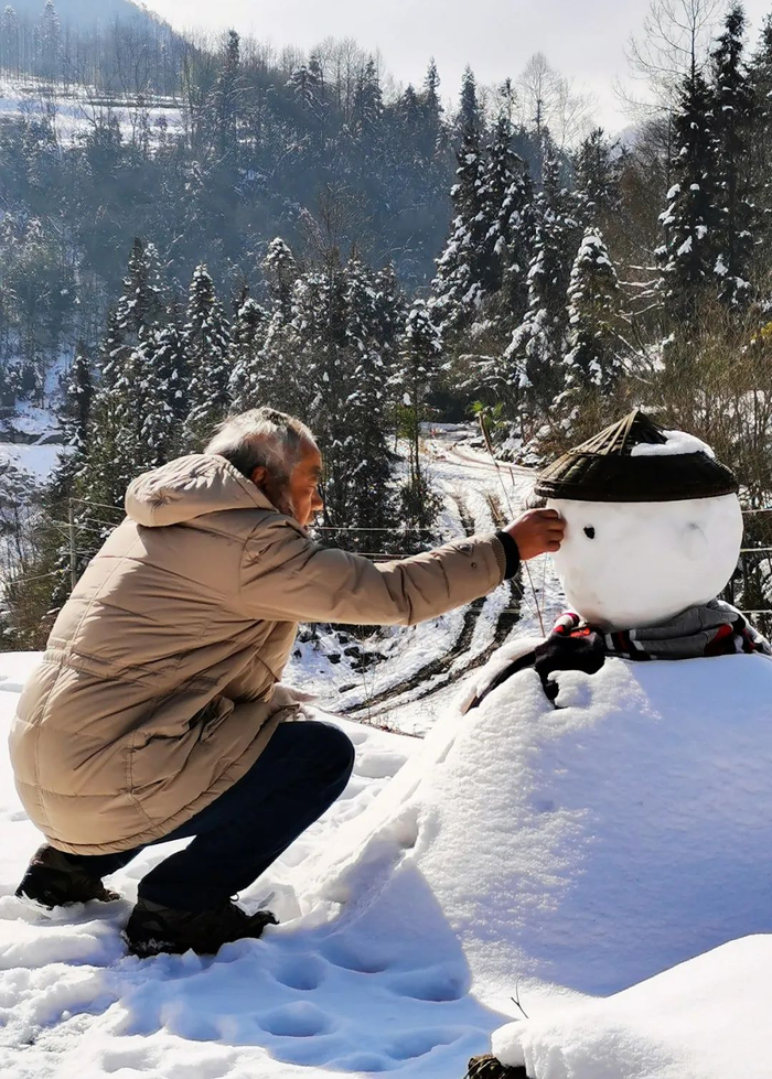 湖北省恩施,老爷爷在堆雪人