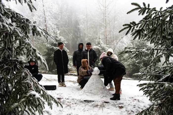 重庆巫山梨子坪森林公园内银装素裹,游客堆起了雪人