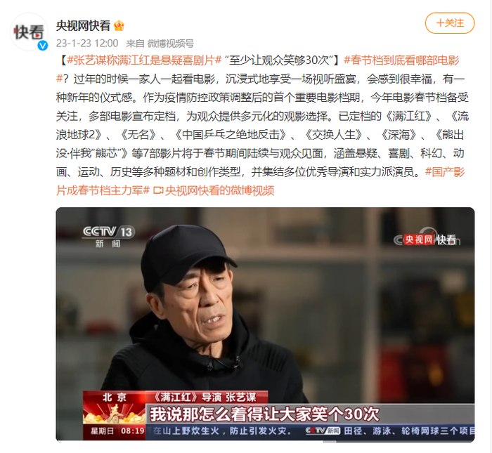 据@央视网快看1月23日消息,张艺谋在接受采访时称《满江红》是悬疑喜剧片,张艺谋称:“悬疑和喜剧是俩动作,在情感上是俩动作,我给自己定的目标,我说那怎么着得让大家笑个30次,大笑、会意地笑、嘴角咧起来笑,得有30次才够(喜剧)的量。