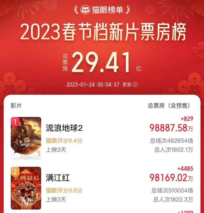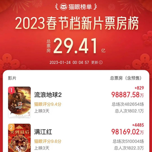 其中,《满江红》和《流浪地球2》在大年初二,双双突破9亿元大关,截至1月24日00时4分,《流浪地球2》已达9.888亿元(含预售),《满江红》已达9.816亿元(含预售),二者之间的差距正在迅速缩小。从实时票房、上座率和排片占等数据来看,《满江红》的数据已经超过《流浪地球2》。