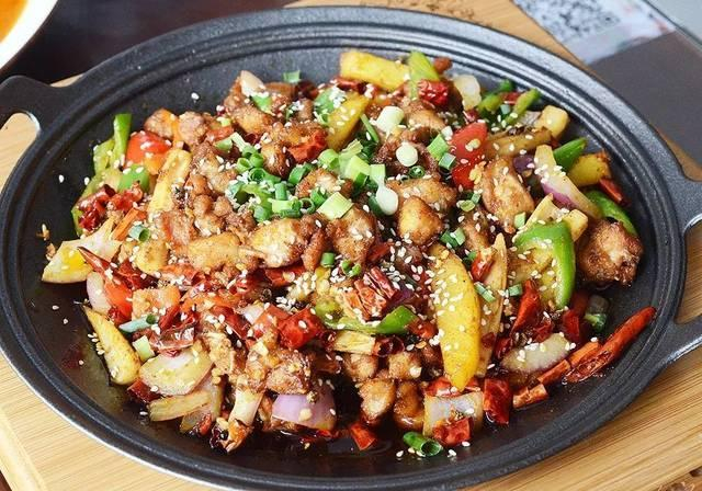 干锅兔虽然与鲜锅兔只有一字之差,但两道菜却是完全不同的风味,干锅兔的特点在于干、香,以干辣椒炝炒的方法烹制,再配上洋葱、土豆、青椒等配菜,兔丁味厚香浓,有嚼劲但不塞牙,配上饭是越吃越香。
