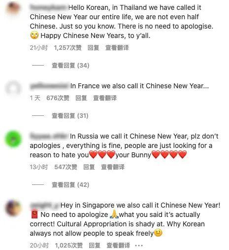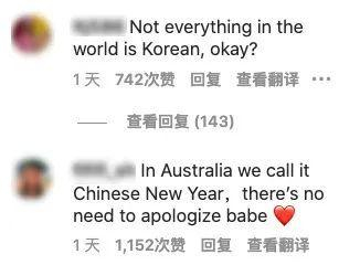 然而,评论区“翻车”了,俄罗斯、美国、法国、澳大利亚、泰国、新加坡等国网友纷纷留言称“不必道歉”,“在我们国家,也称春节为Chinese New Year”,还有人一针见血地写道“请韩国人停止文化挪用”。