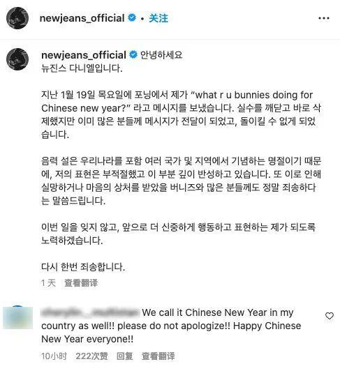 此事在韩网引发争议后,丹妮尔1月21日通过组合Instagram账号发文道歉,称自己意识到“错误”后立即删除了那句问候信息,但由于很多人已经看到了,变得无法挽回。