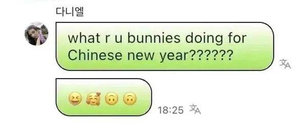 1月19日,丹妮尔通过该组合专用粉丝交流软件询问粉丝(bunnies为NewJeans官方粉丝名)春节要做什么,并将春节称为“Chinese New Year”。