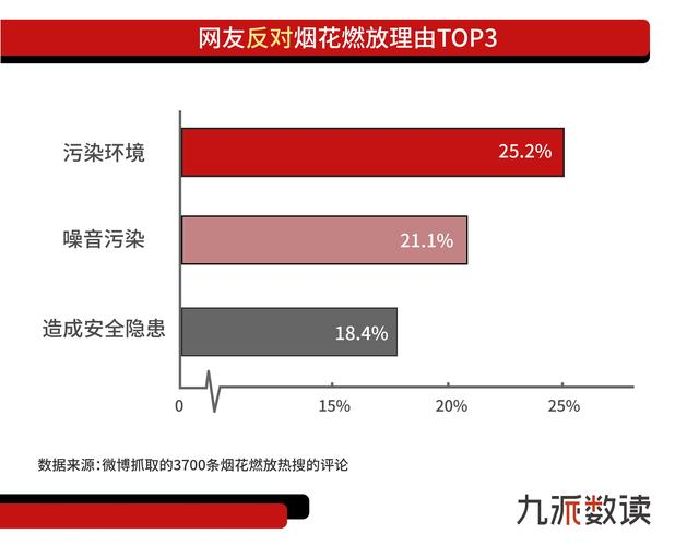 “污染环境”、“噪音扰民”以及“引发安全事故”是网友反对烟花爆竹燃放的三大理由。其中“污染环境”的相关评论有37条,数量居反对声音第一。