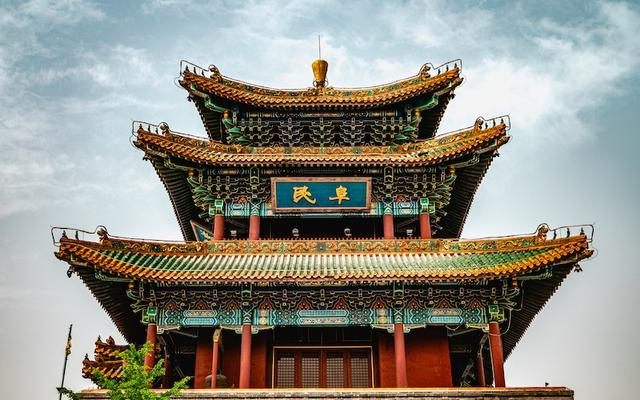 永宁古城的东南西北分别建有城门和瓮城,外带护城河,属于典型的北方方城的布局。这里的地标性建筑是玉皇阁,耸立于城中心,门洞四面通达,上有三层飞檐斗拱的塔楼,气势恢宏。据说,玉皇阁中心的南北延长线,北穿缙阳山峰头,南穿十三陵,和天安门同在中轴线上。历史上,永宁古城不仅是边塞兵镇,商贸活动也非常活跃,城中开设众多商号。据统计,民国时期,永宁大小商号140多家,包括烧锅行、六米行、金银首饰行等,这里的烧酒、香油、中草药都远销到山西、内蒙古等地。如今,复建后的商业街上,药材、丝绸、古玩等店铺鳞次栉比,人来人往,重现了明清时期的繁华景象。